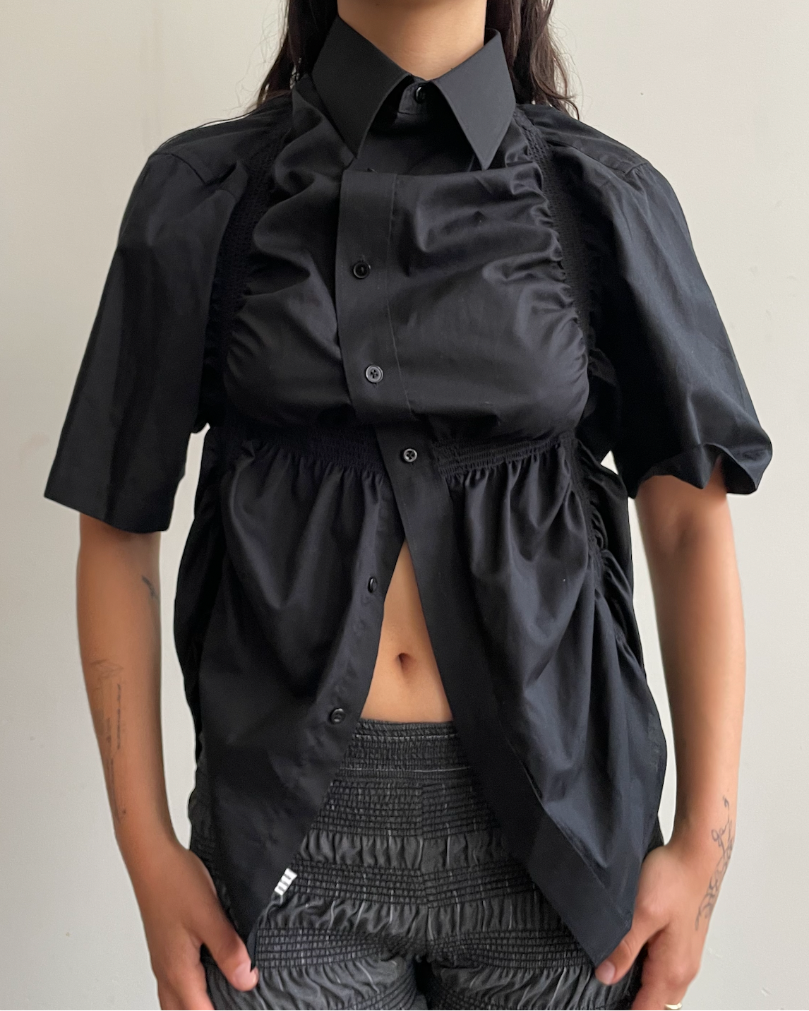 One-of-one reworked short-sleeve button down shirt with elastic shirring along the shoulders and waist. Hand wash cold or dry clean.