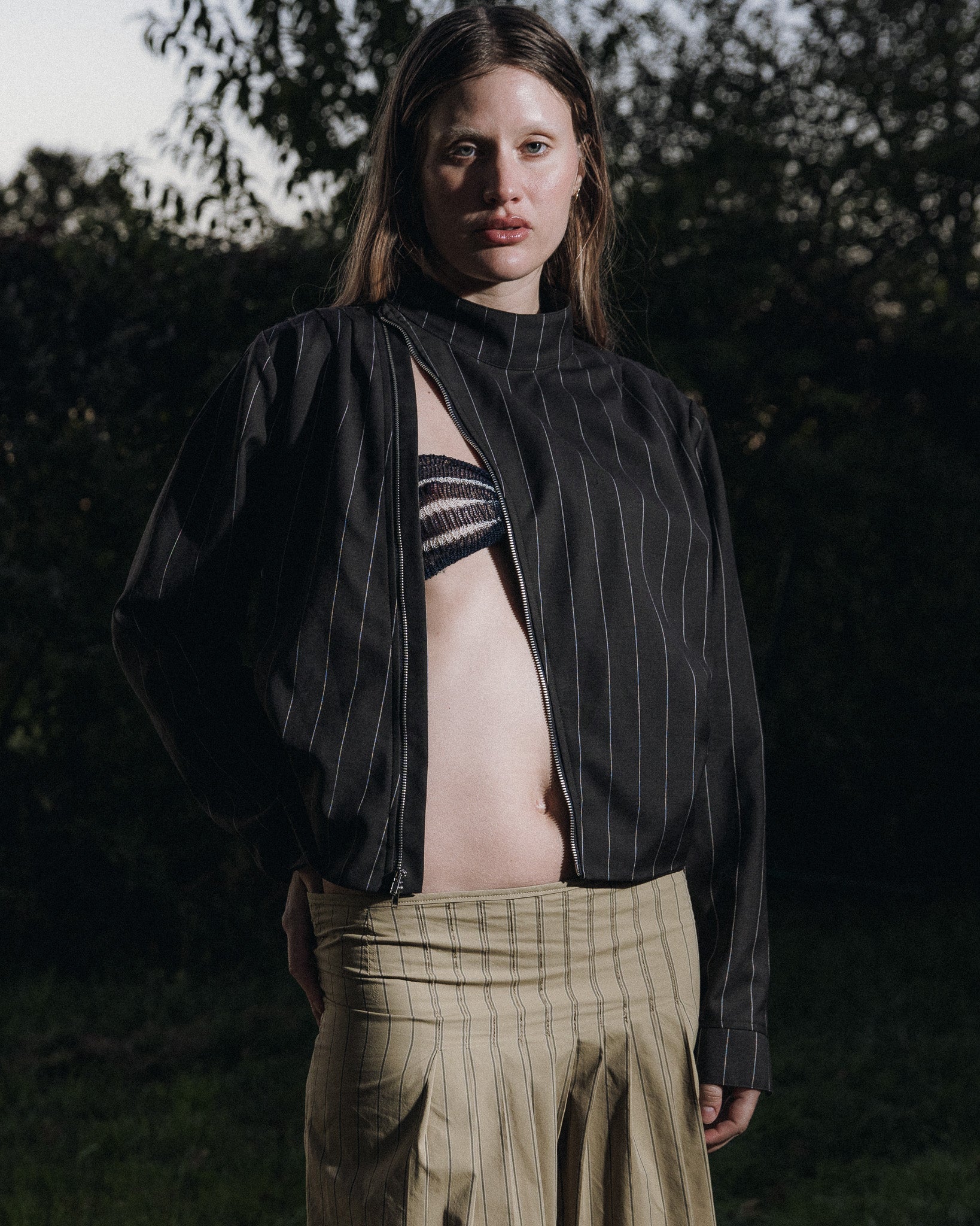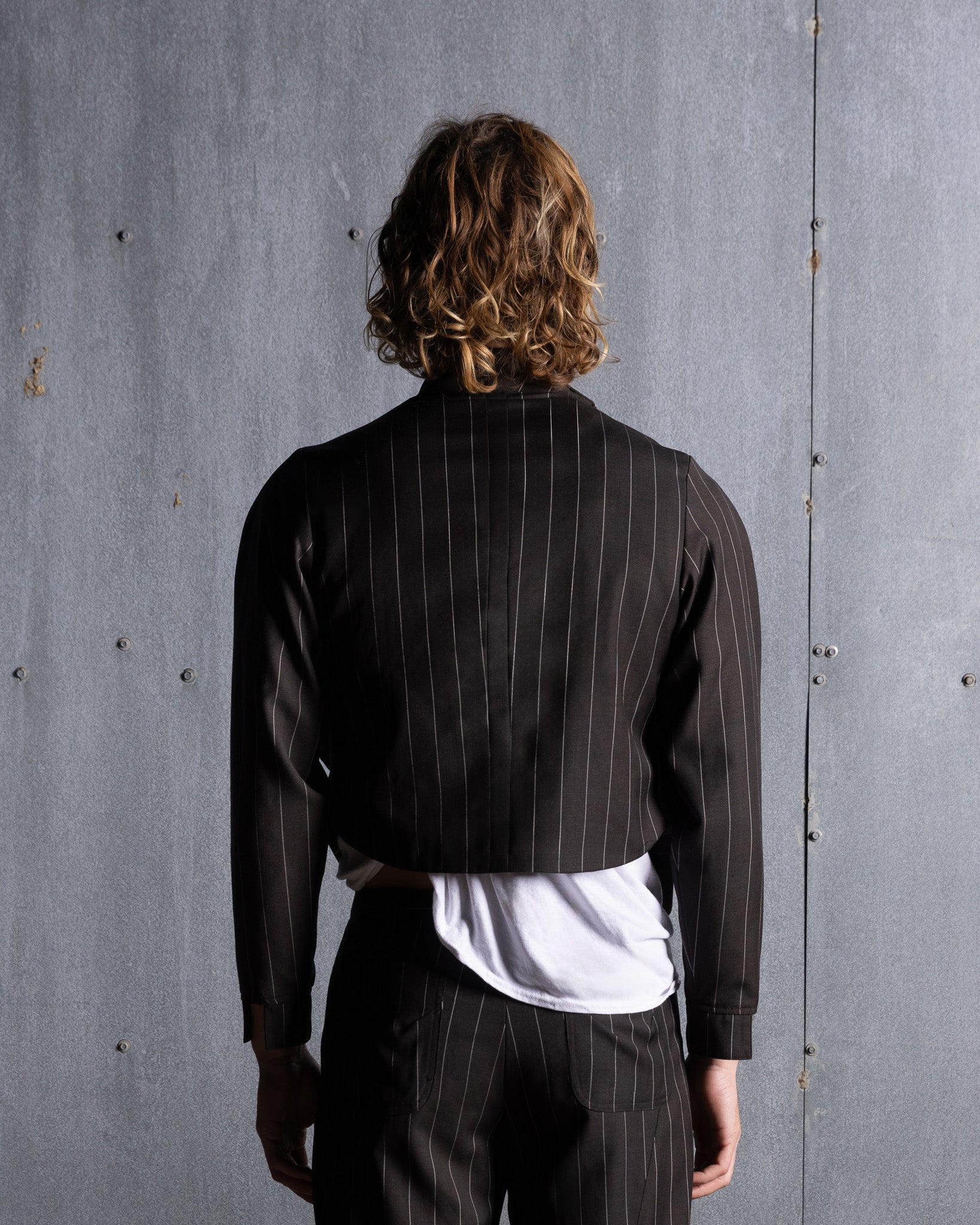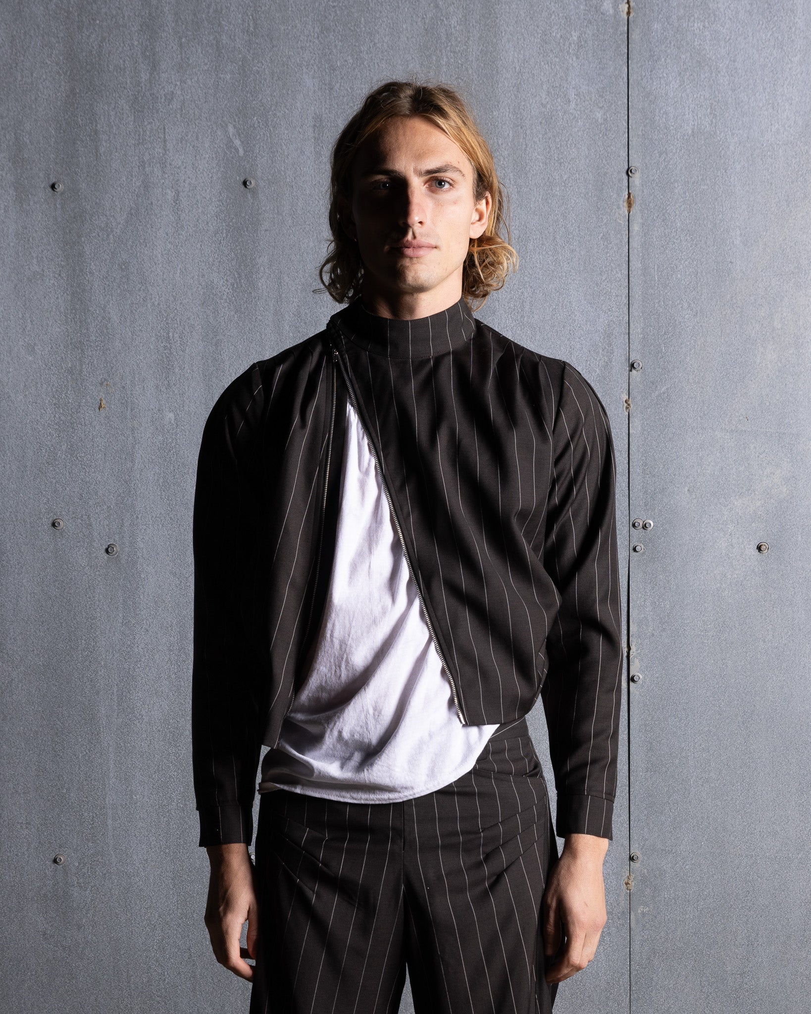 Asymmetrical suit jacket featuring pleats at the shoulder and side seams for a draped effect. Two-way metal zipper across the front and stand collar with metal snap closure. Elegant center back seam detail. Made with our classic fine wool suiting, silk lining.