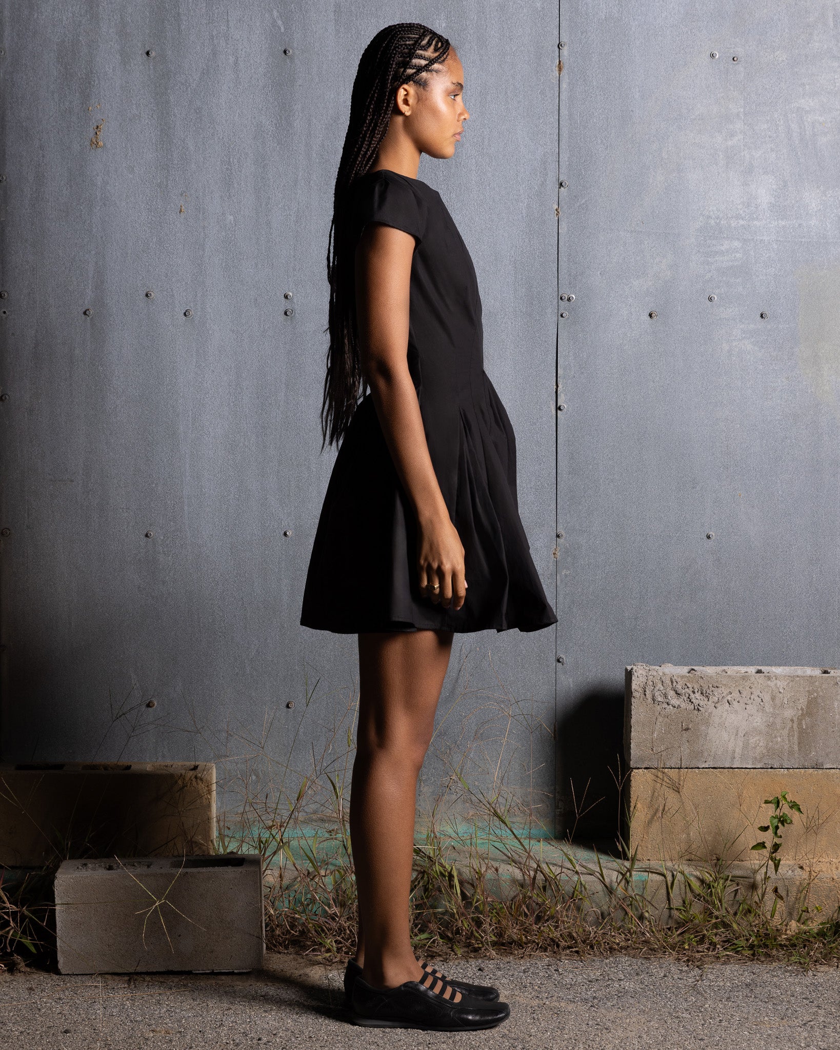This asymmetrical wrap dress features a tailored paneled bodice with pleated inserts flaring out from the waistline. One cap sleeve with pleats at the shoulder and adjustable d-ring ties at the waist for a fitted look. Voluminous, gathered skirt with internal snap closure. 100% cotton fabric.