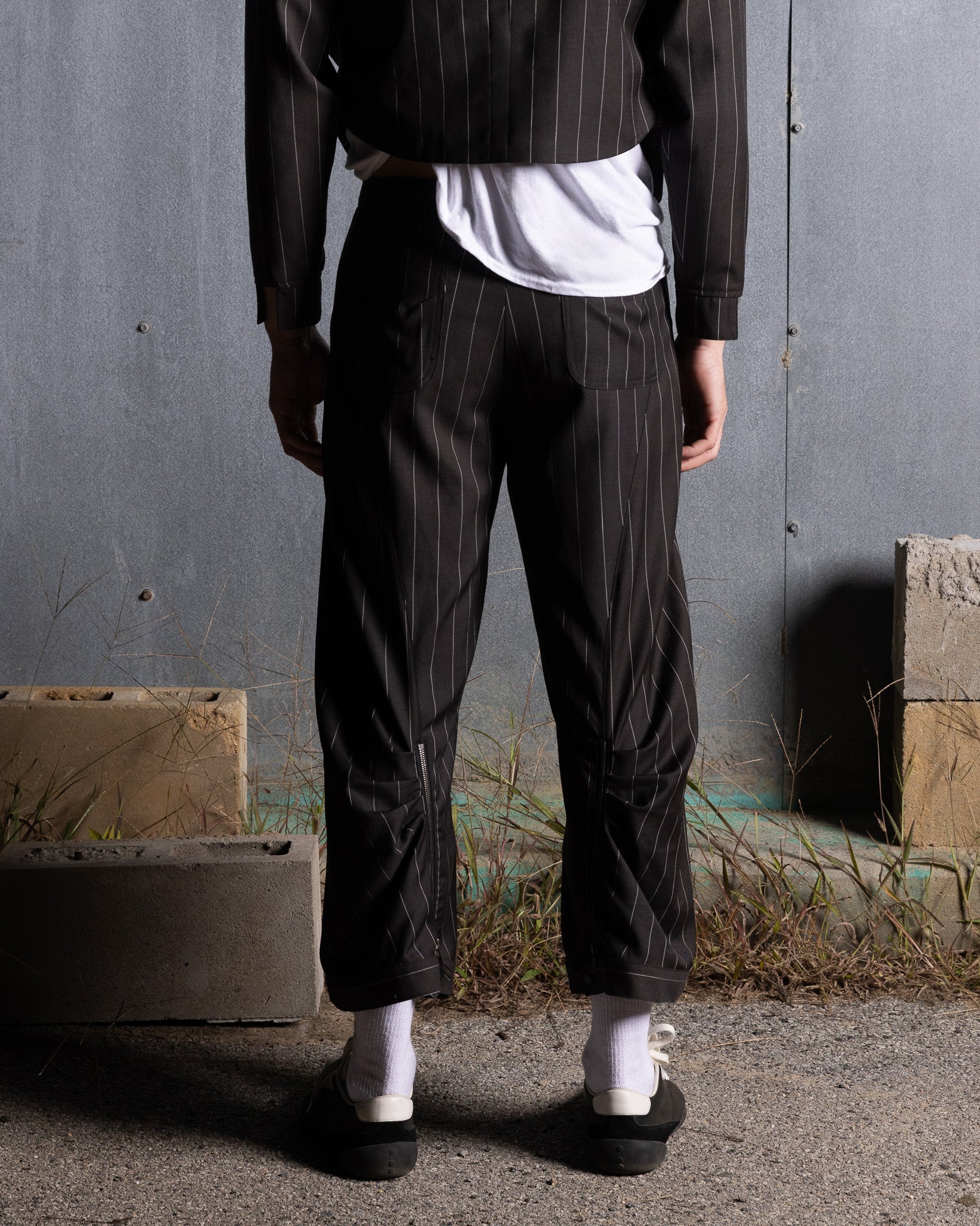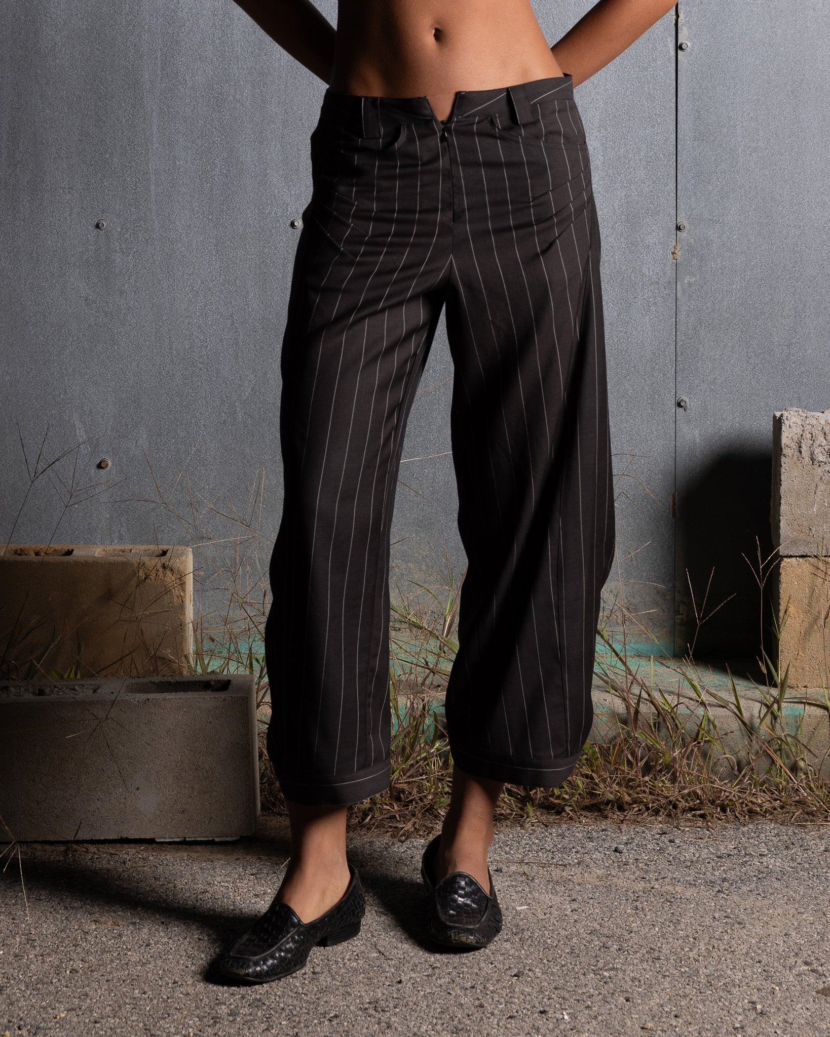 Low-waisted wide-leg trousers featuring a center-slit waistband and pleating at the front and back. Curved seams along leg, opening at the lower back knee with a metal zipper and snap closure. Four pockets, belt loops, and front invisible zipper closure. Made with our classic fine wool suiting fabric.