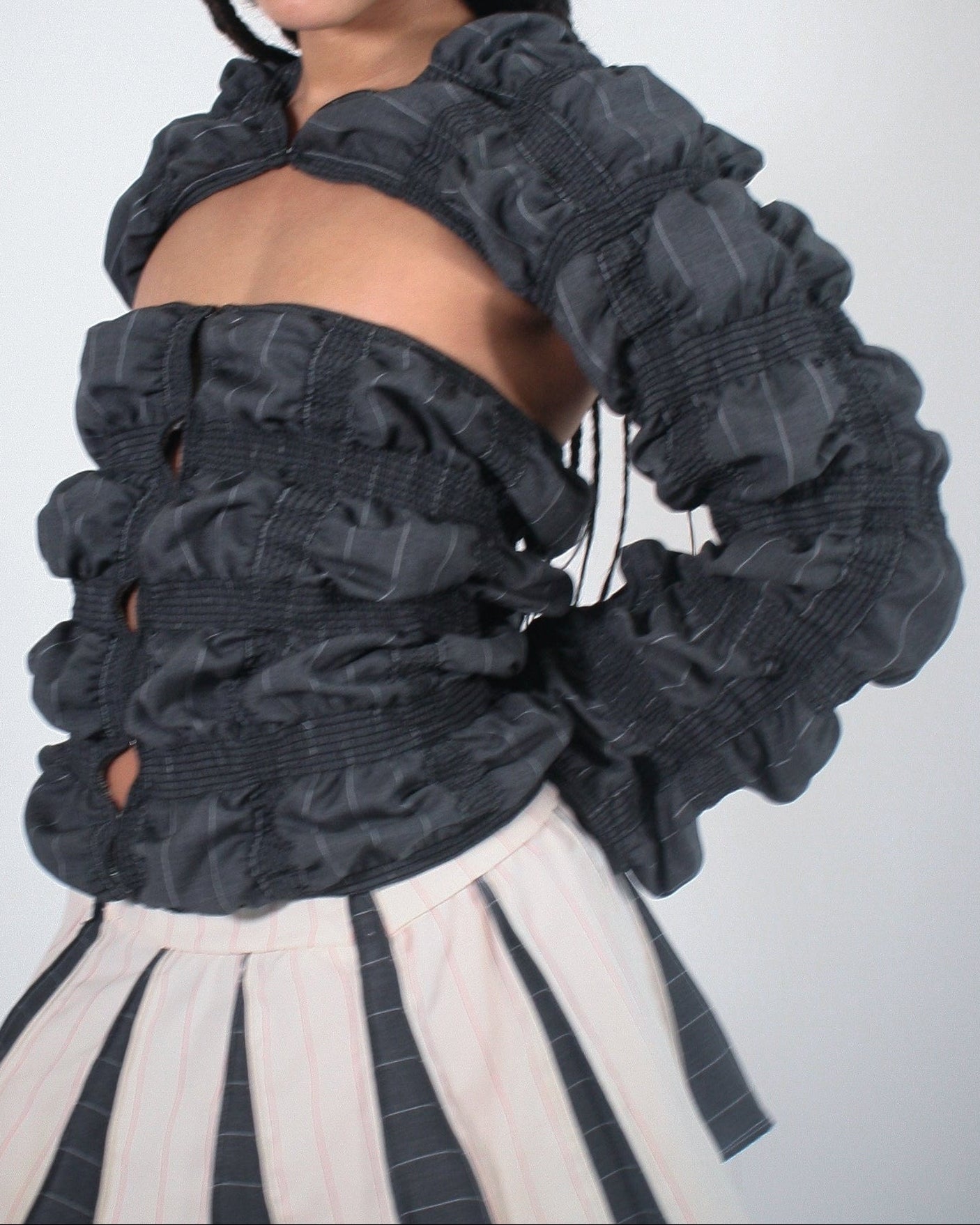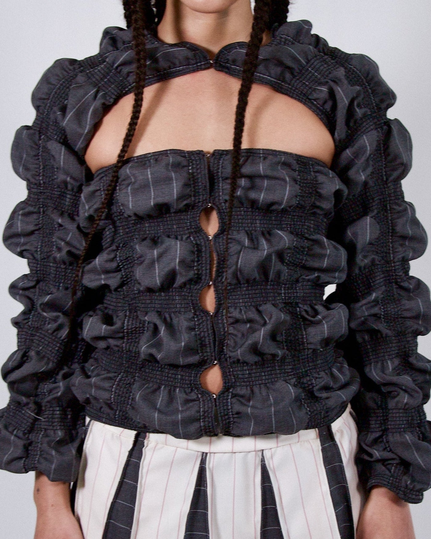 Bolero-style shrug with hook and eye closures at the front. Handmade in NYC with deadstock fabric.