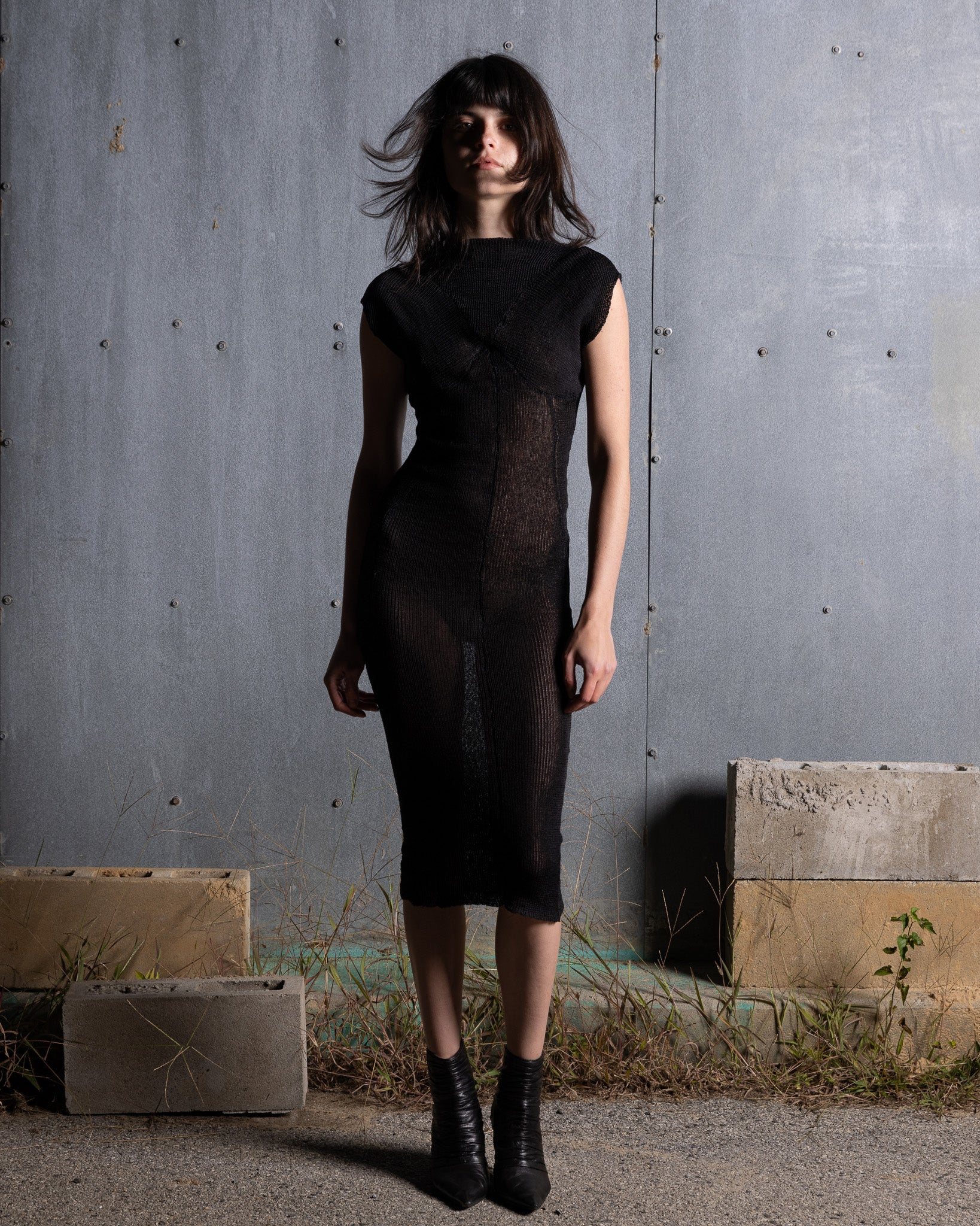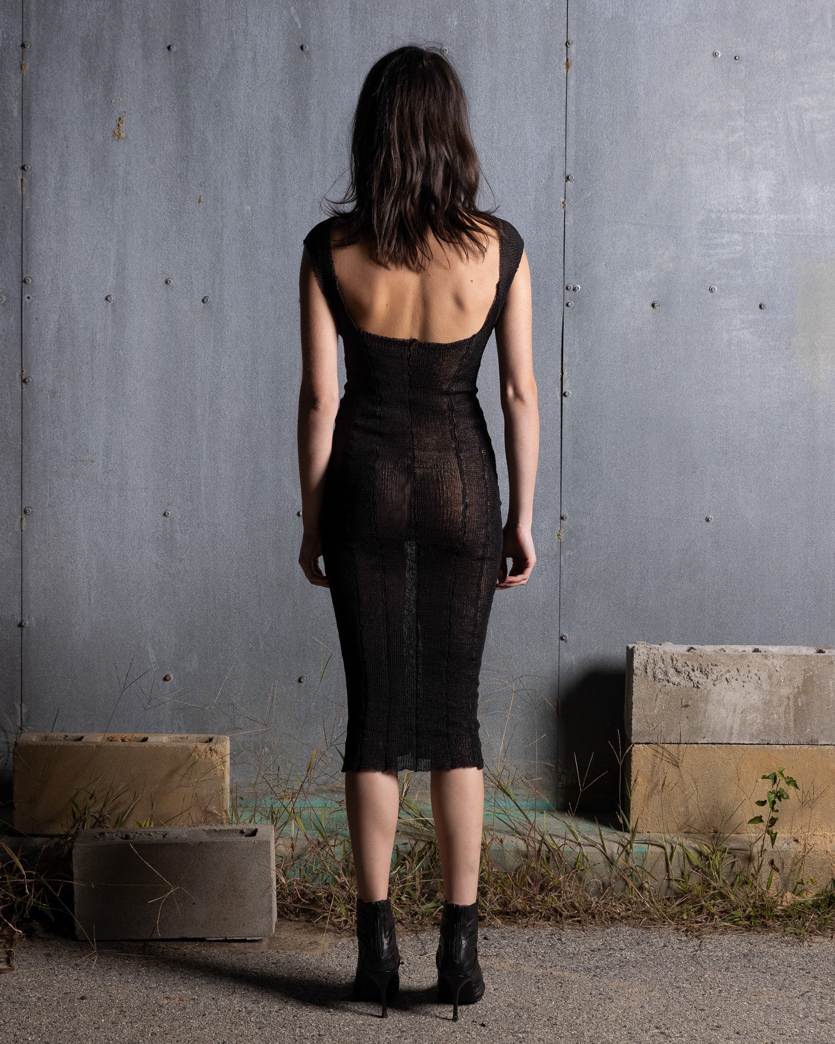 This knit dress features a corset-style panelling throughout to create curved lines across the body and a scooped low back. Fitted, midi length. Hand loomed on a domestic knitting machine with deadstock yarn.